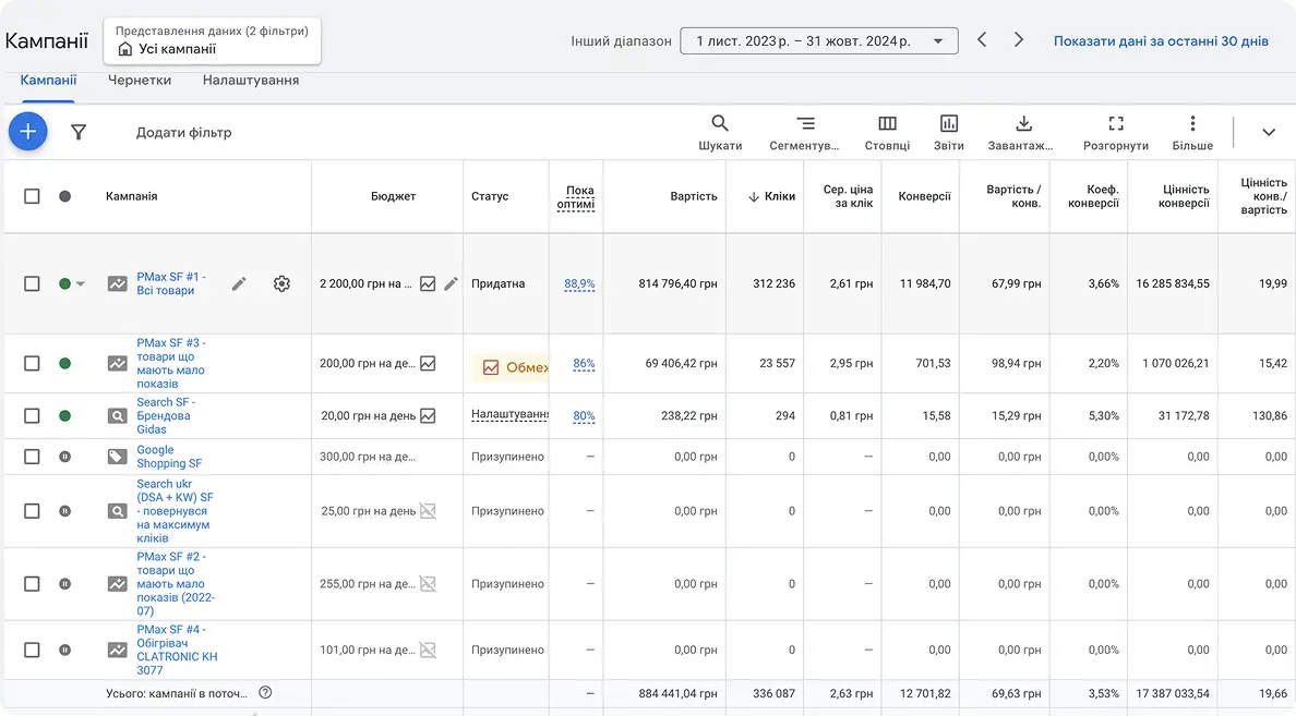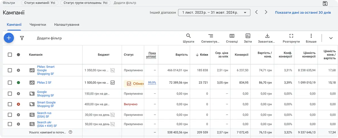 1. Налаштувати Google Shopping і Performance Max для основного сайту та окремо для магазину на prom.ua.